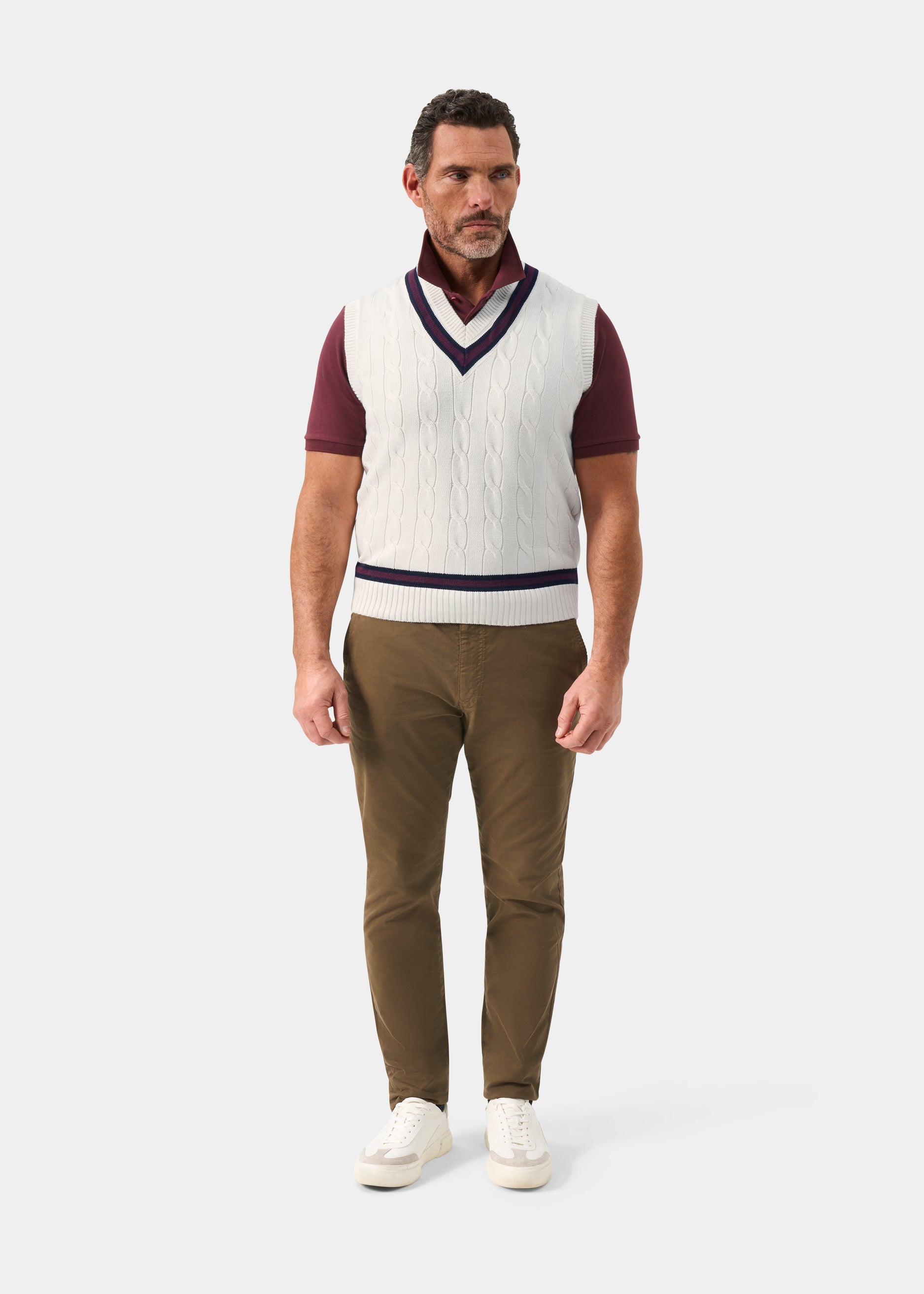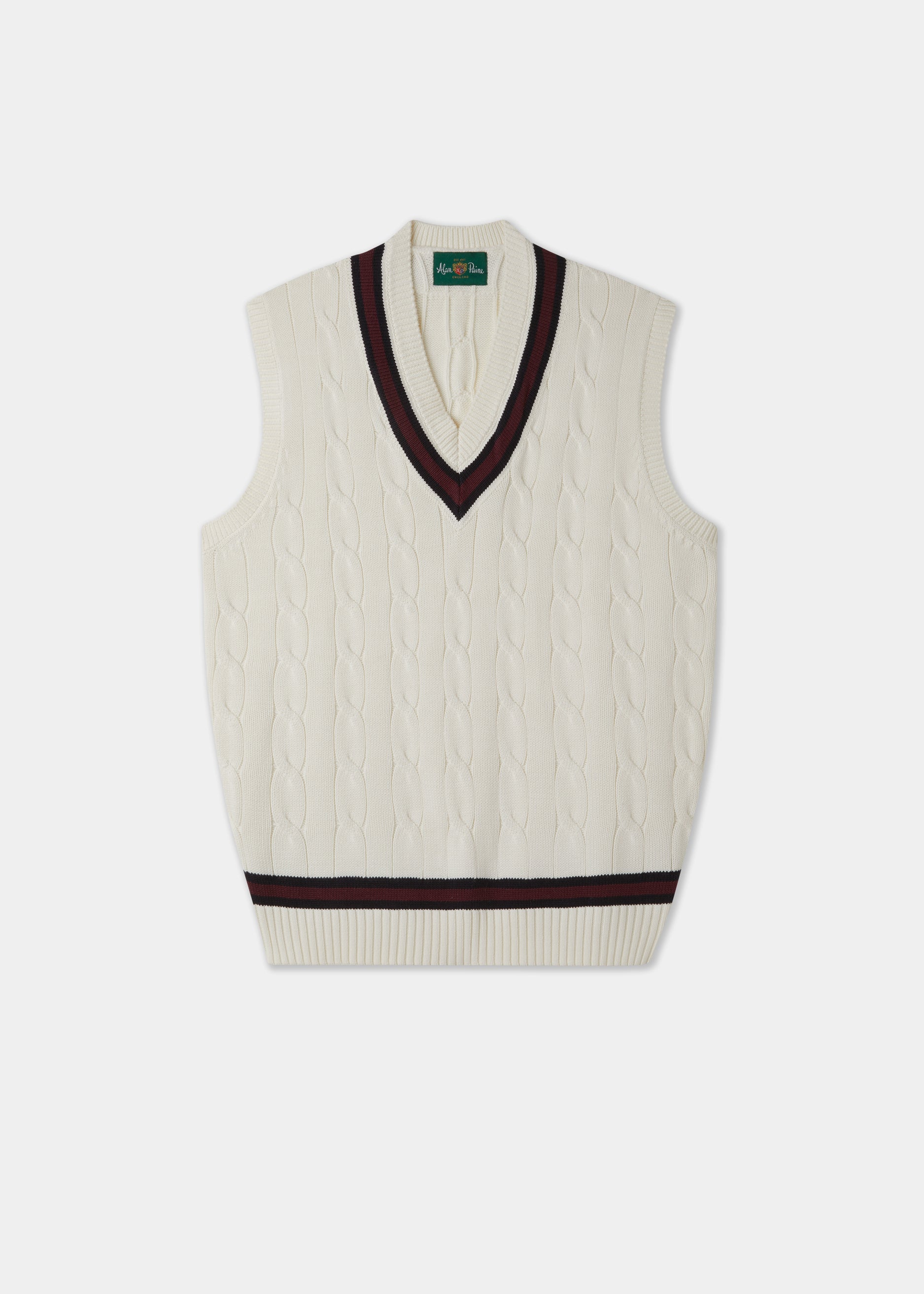 Bomullskabelstickad tröja var mer eller mindre okänd innan William Paine utvecklade den till en crickettröja efter den kulturella ökningen i popularitet för klassiska brittiska sporter på 1920-talet. Vår slipover i ren bomull behåller den traditionella kabelstrukturen men är förbättrad med moderna färger, detaljer och en uppdaterad passform. Upplev en bit av vår historia samtidigt som du omfamnar den nuvarande trenden för samtida sportkläder.